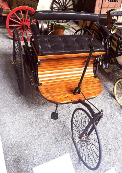 画像はとなりの建物の自動車たちの中にあったパテントモートルヴァーゲン。御笠ノさんにもメルセデスの魅力は車の中でしっかりと伝えた。