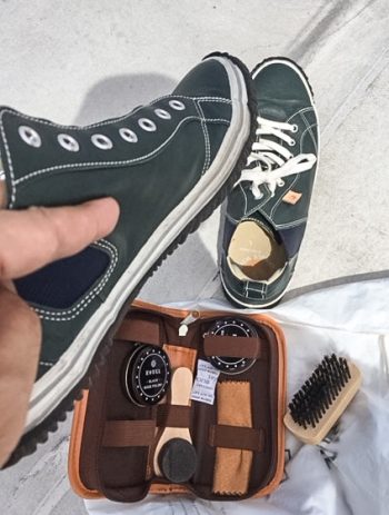 上に出て革靴(スニーカー)を磨いてみた。(ちなみに上半身は裸、笑。日焼け目的ぢゃないのよ。)