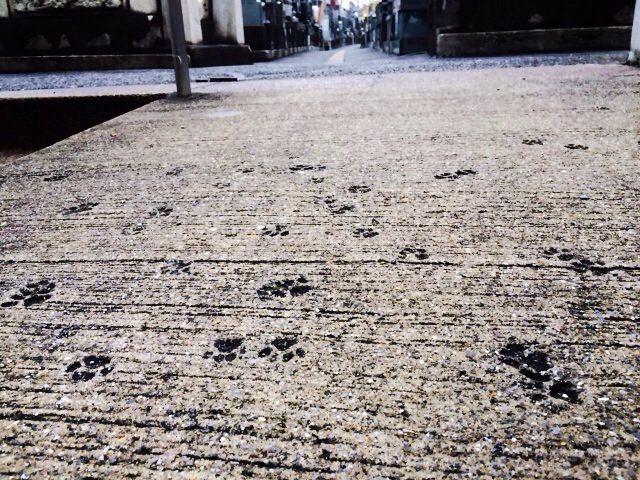 お寺の墓地の入り口のコンクリのスロープをよく見ると猫の足あとが、、ずいぶんと派手に荒らしたな、笑