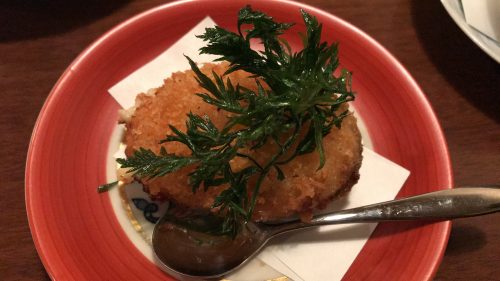 画像はアワビの貝殻に乗せられたカニクリームコロッケ♡