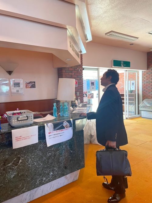 スーツで撮影現場(待機場所)うろうろしてたら仕事で地方のビジネスホテルチェックインしに来たリーマンになって、制作さんがぇ、てなって撮ってくれた。の図。