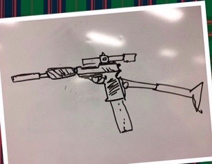 ちなみに写真中央の朝倉さんが持っている銃は稽古場のホワイトボードで渡辺さんが描かれていた↑の銃です。