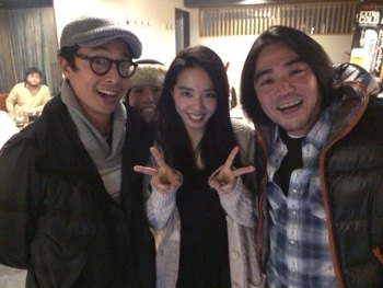 八敷勝と出会った舞台でご一緒だった山岸拓生さんや親父もお世話になっている舞台照明の日高さんのご子息も!なんだか感動的な再会。山岸さんは写真左上にちょこんと写っております。日高さんは写真右。中央のアイリさんも業界的な意味で2世さん。僕の右側に映りこんでいるのは今回の舞台で見事に和服やもんぺ姿が板についていた田中まことさん。写真を撮ってくれた鶴町憲さんやその横にいた八敷勝さんもみんないい人!!